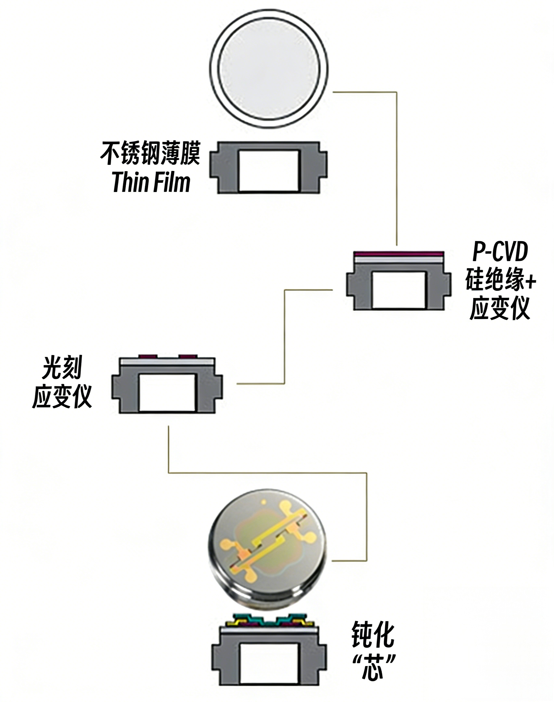 我们通过绝缘、光刻、钝化等精密半导体工艺,在不锈钢基底(17-4PH、316L或A286)上构建惠斯通电桥。其中,CVD工艺是核心——它让非金属硅绝缘层与不锈钢基底形成原子级的牢固结合。